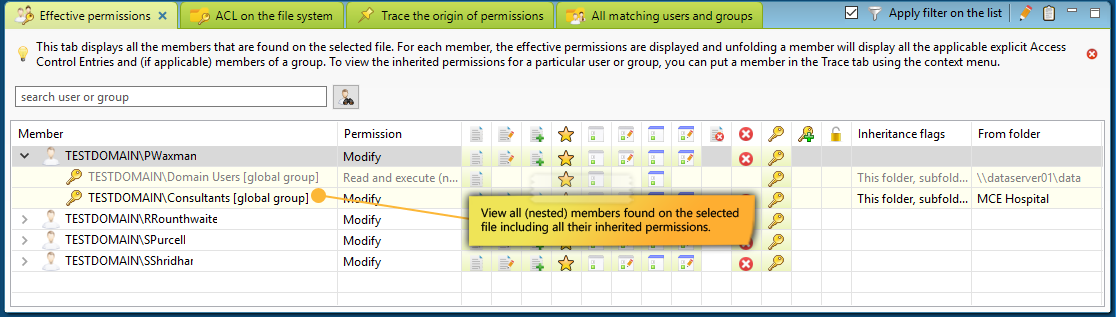 The final tab All matching users and groups can be used to extract all users and groups from the overview. This is useful when the filter criteria yield multiple members and you want to have a overview of unique users and groups that have been found. Each member can be expanded to view all the explicit permissions on every directory for that member, including the ones granted through nested group memberships:
